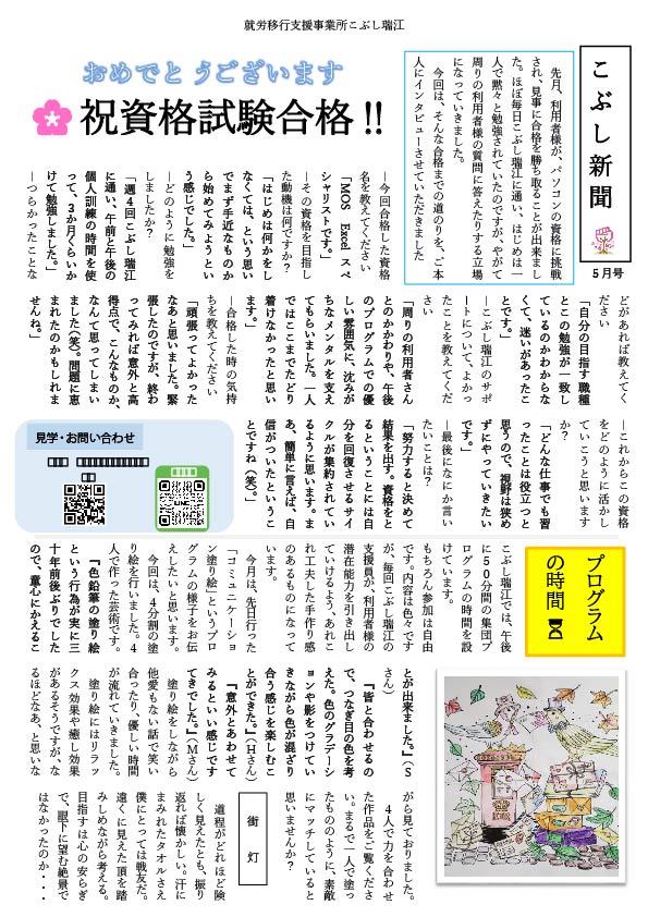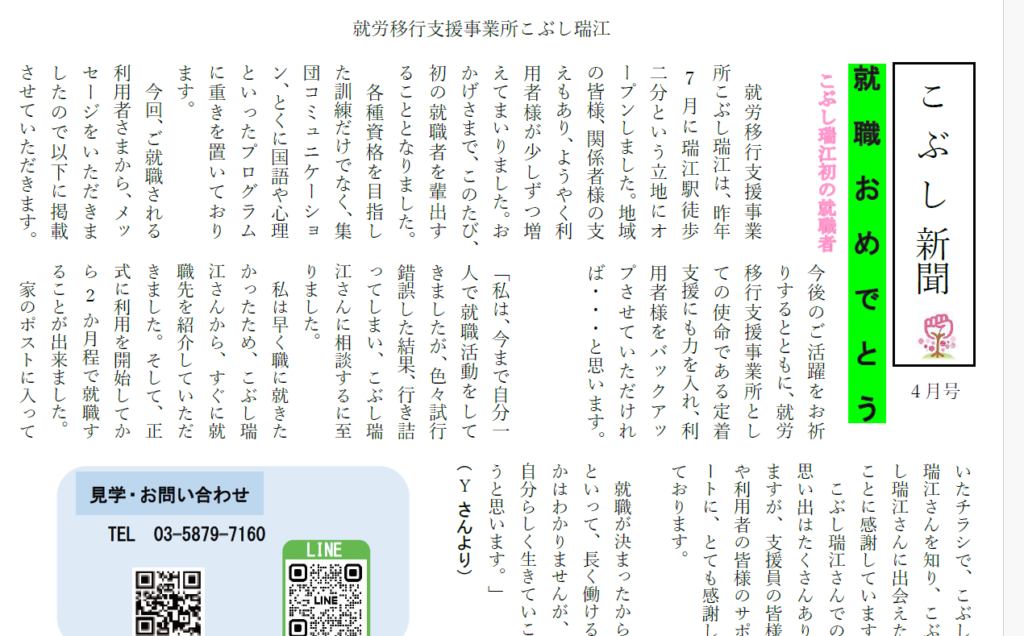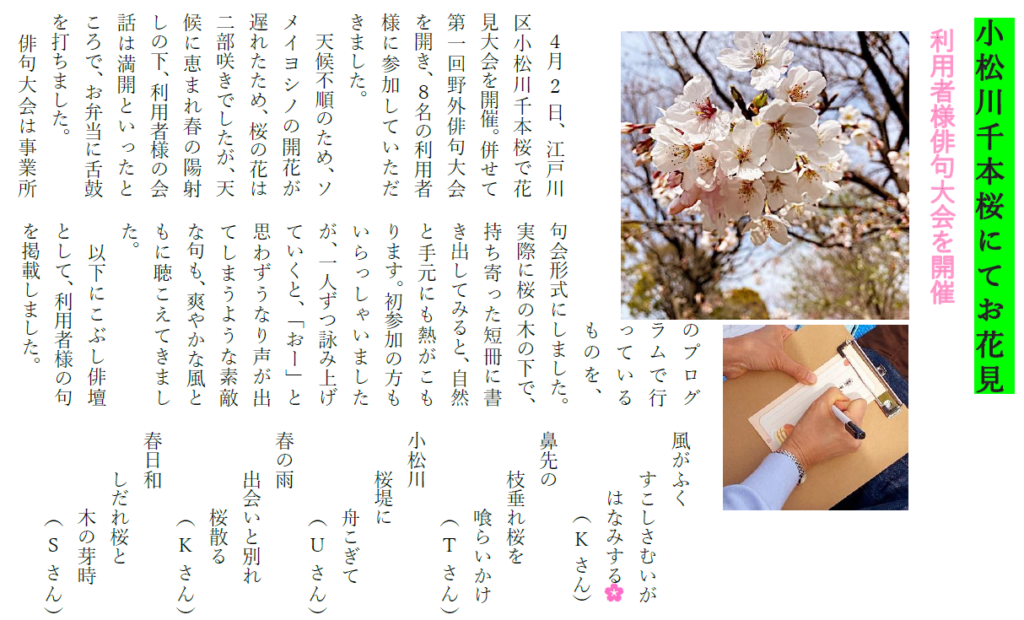 こぶし瑞江も昨年7月に新規開所して初めての新年度、利用者さんにも新たな気持ちで頑張っていただけるようにいろいろチャレンジしていきたいと考える次第です
